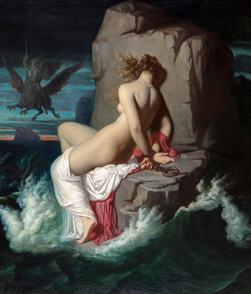 Léopold Burthe’s Angelique is a recently rediscovered masterpiece by a native New Orleanian who lived and painted in Paris in the 1840s and ‘50s. Presented at the Paris Salon of 1852, Angelique depicts a scene from the epic 16th century poem Orlando Furioso by Ludovico Ariosto, a story commonly presented in French painting of this period. Angelique has been chained to a rock and a sea monster threatens to attack just as Orlando, a chivalrous knight, astride a hippogriff, arrives to save his beloved. Associated with the “Neo-Greeks,” Burthe’s academic style focuses on single-figure tragic heroines staged in stylized, fixed poses silhouetted against stark backgrounds.